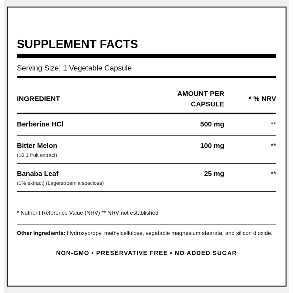 Това е уникална формула, защото съдържа Bitter Melon 100mg и Banaba leaf 25mg, 2 растителни съставки с благоприятни свойства върху метаболизма на глюкозата. Цялостното им синергично действие може да допринесе за подобряване на метаболитното здраве и засилване на ефектите на берберина.