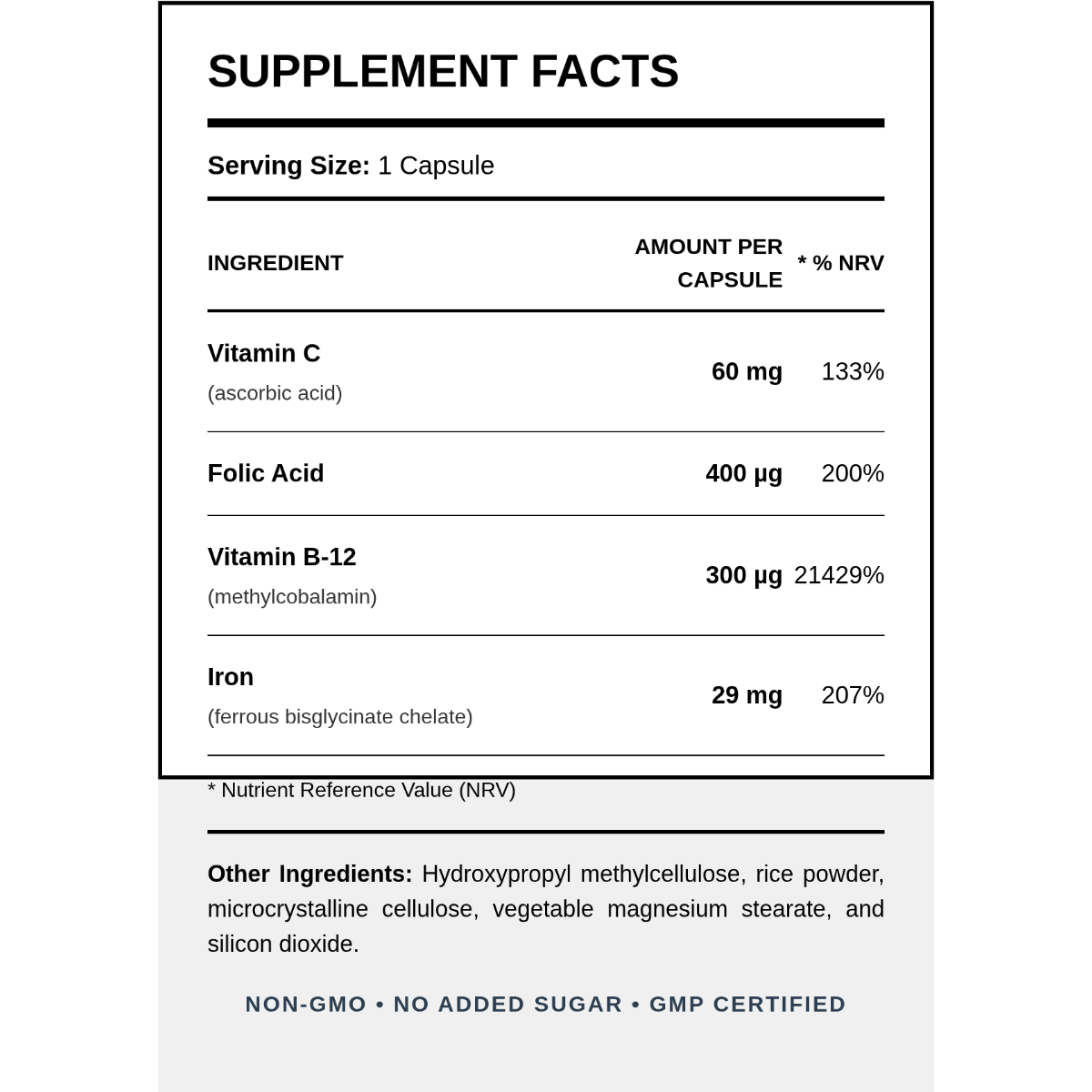 | B-12 (метилкобаламин) | 300mcg (21429%) |