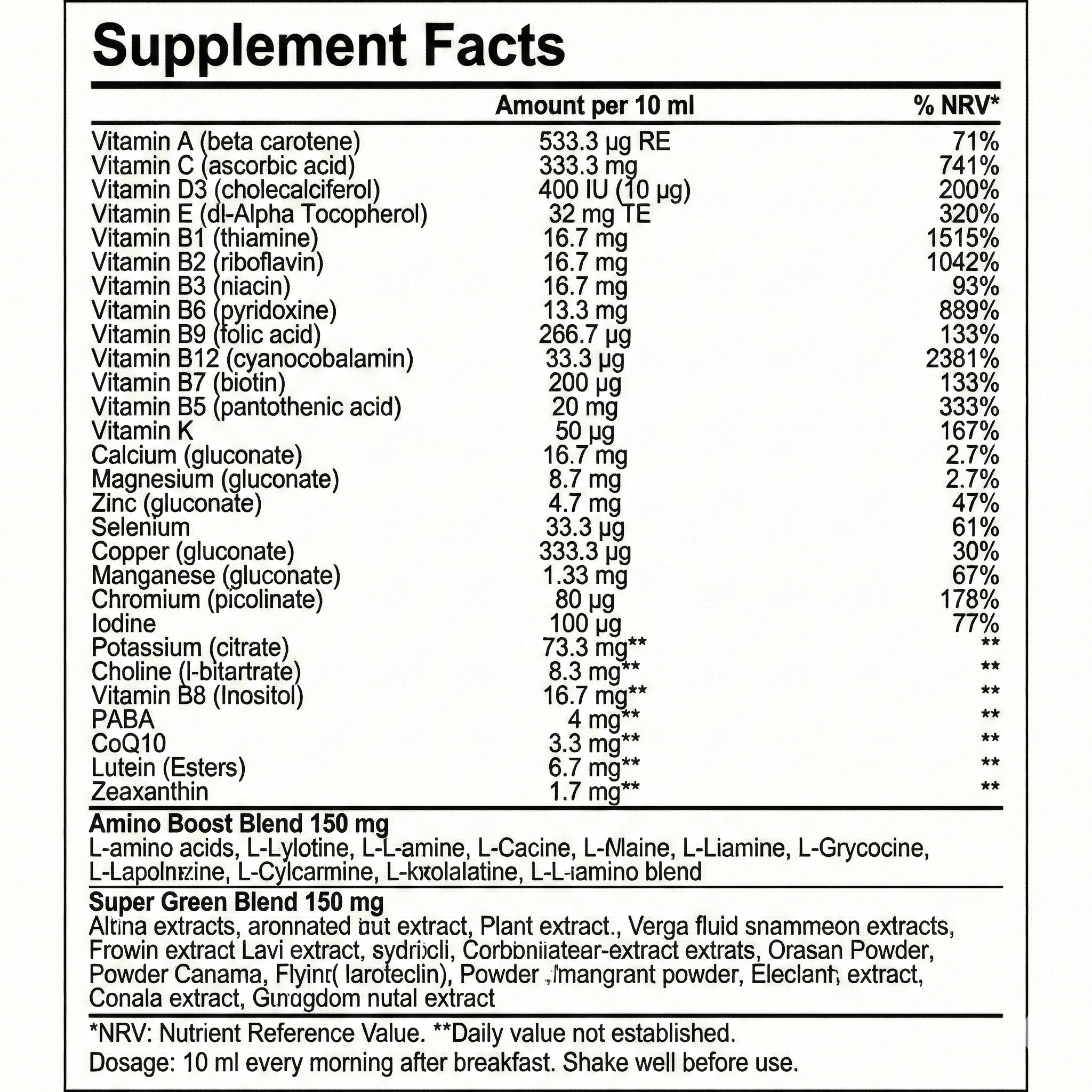 Συνιστώµενη δοσολογία: 10 ml κάθε πρωί μετά το γεύμα. Ανακινήστε καλά πριν τη χρήση. Μετά το άνοιγμα, διατηρείται στο ψυγείο έως και 2 μήνες.