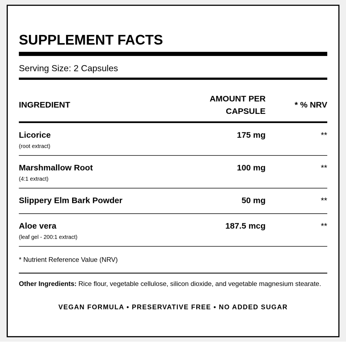 Derudover understøtter barkpulveret fra glat elm (Slippery Elm) (50 mg) genopbygningen af væv, mens Aloe Vera (187,5 mcg) forbedrer fordøjelsen og hydrerer mave-tarm-systemet.