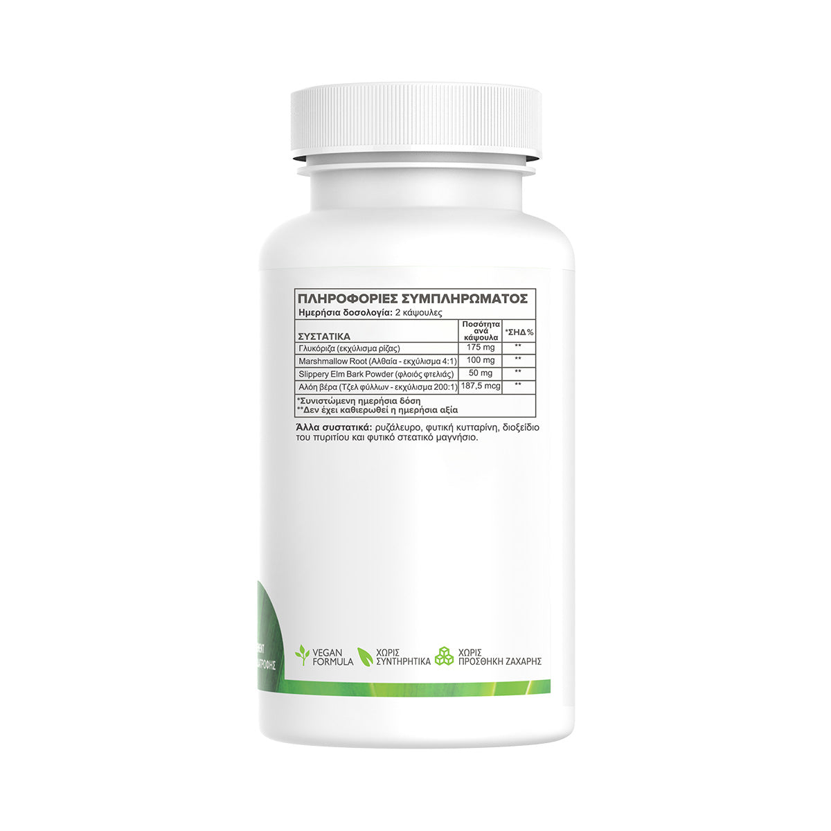 Es enthält Süßholz (175 mg), das beruhigende Eigenschaften für die Speiseröhre und den Magen hat, sowie Eibischwurzel (100 mg), die die Schleimhäute des Magen-Darm-Trakts schützt.