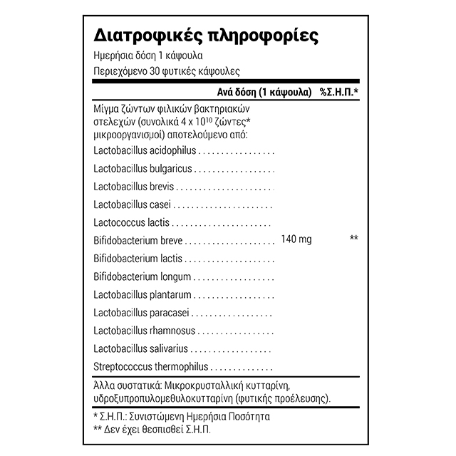 Περιέχει δεκατρία ευεργετικά βακτηριακά στελέχη (στελέχη γαλακτοβακίλλων, στελέχη Βifidobacterium lactis και Streptococcus thermophillus), που συμβάλλουν στην καλή λειτουργία του πεπτικού συστήματος και στην διατήρηση της ισορροπίας της μικροχλωρίδας του πεπτικού συστήματος.