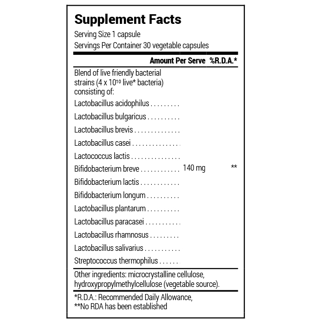 Συμπλήρωμα διατροφής στην κατηγορία προβιοτικών με σαράντα δισεκατομμύρια ευεργετικά βακτήρια, από 13 στελέχη, για την καλή λειτουργία του εντέρου.