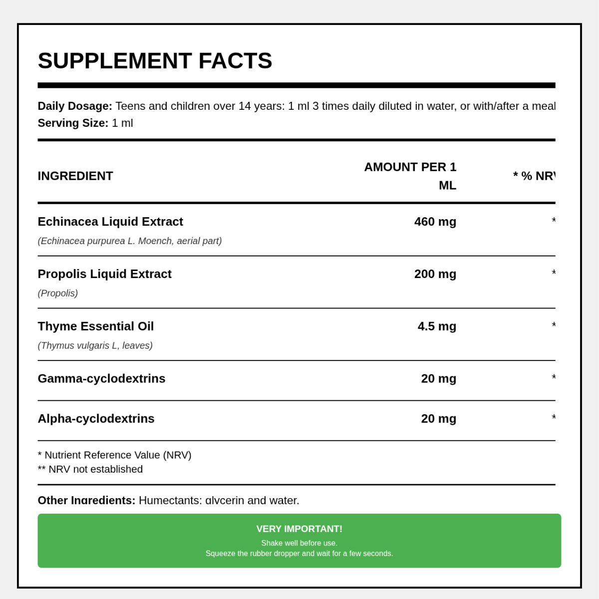 | Flüssiger Echinacea-Extrakt (Echinacea purpurea L Moench, oberirdischer Teil) | 460mg (*) |