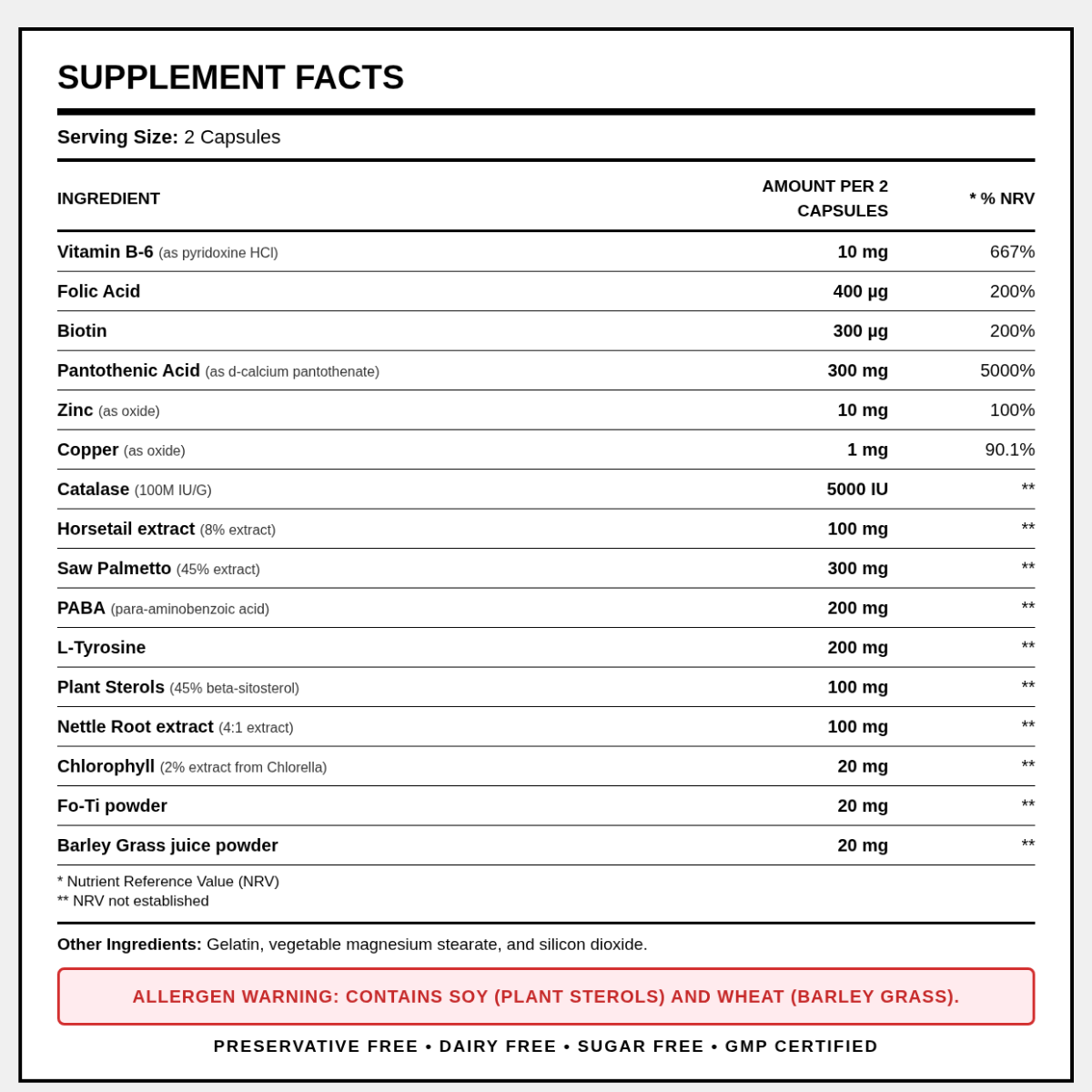 • Vitamin B6, Biotin, PABA, Pantothensäure und L-Tyrosin, die essentielle Nährstoffe sind und eine entscheidende Rolle für die Haargesundheit, ihren Glanz und den Zustand des Haares spielen.