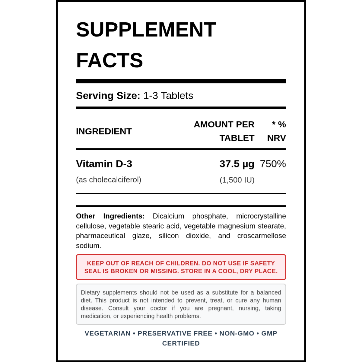 Vitamin D-3 (Cholecalciferol) 37.5mcg (1500IU) (750%)