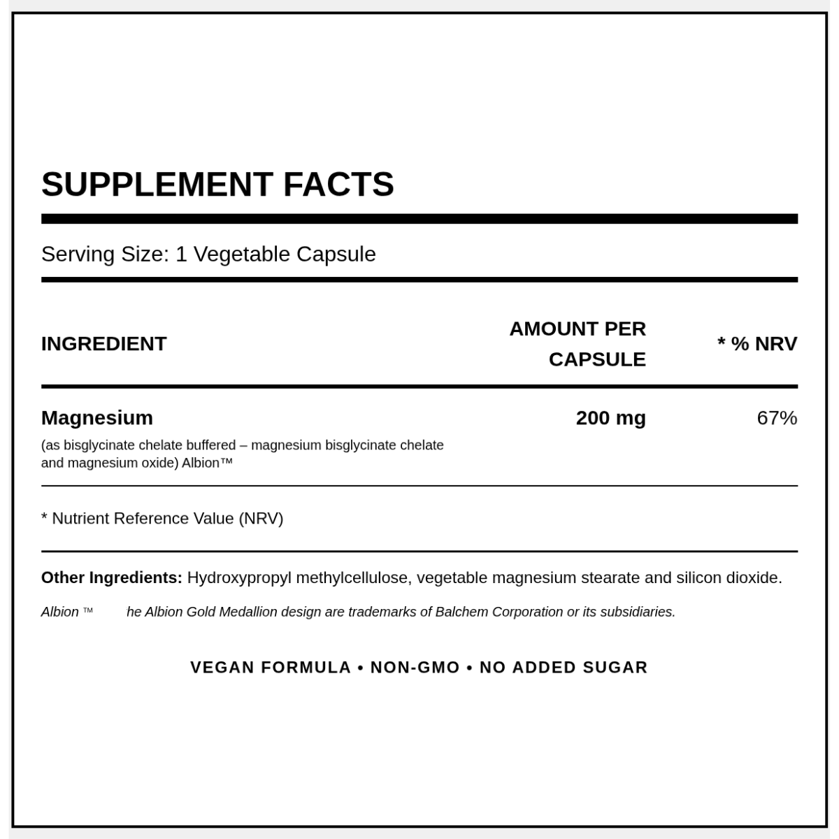 Magnesium (als pH-gepuffertes Magnesiumbisglycinat-Chelat – Magnesiumbisglycinat-Chelat und Magnesiumoxid) Albion™ 200mg (67%)