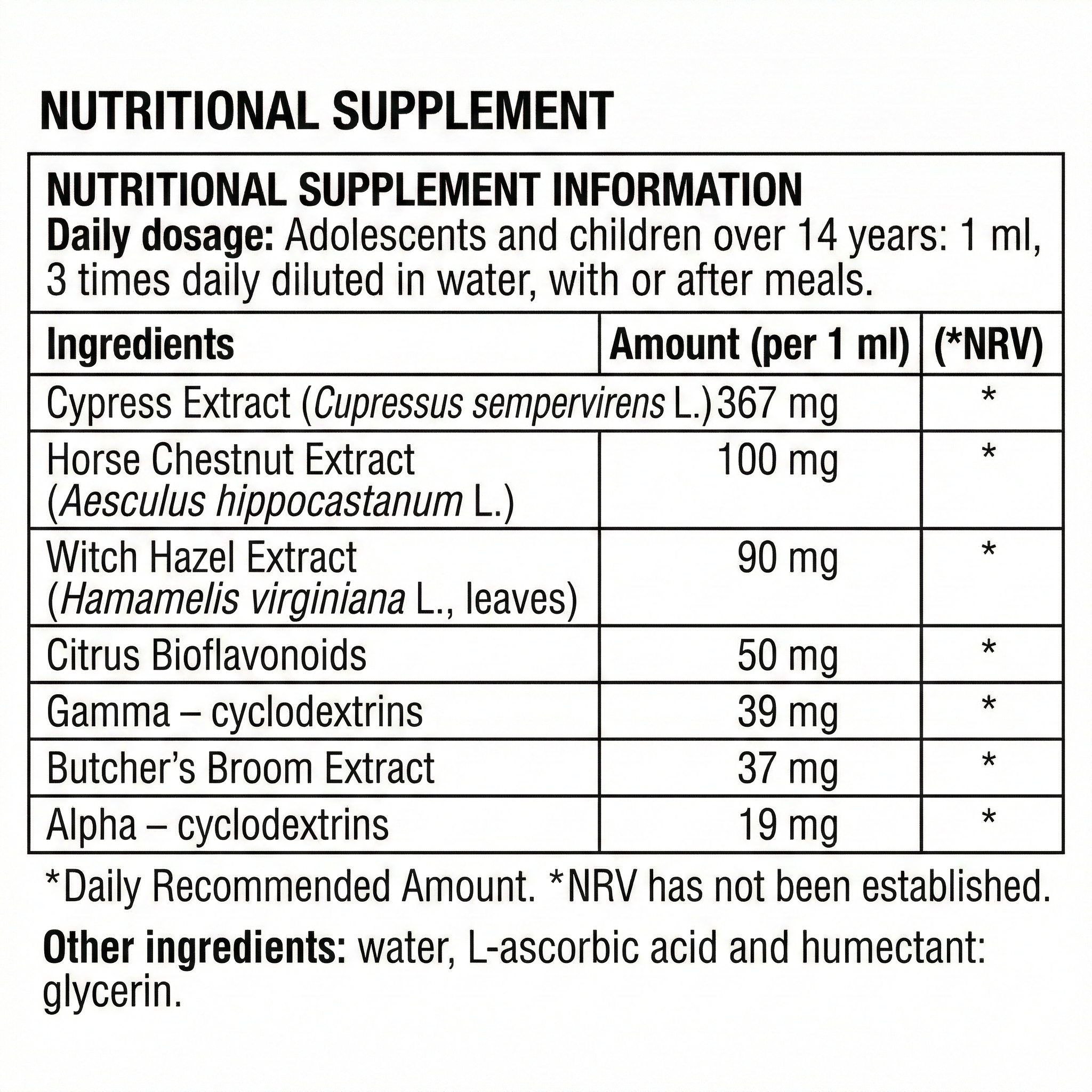 Εκχύλισμα Αγριοκαστανιάς: είναι γνωστό για τις αντιφλεγμονώδεις και αντιοξειδωτικές του ιδιότητες και μπορεί να βοηθήσει στη μείωση της φλεγμονής, την ανακούφιση από τη φλεβίτιδα και τη βελτίωση της κυκλοφορίας του αίματος.