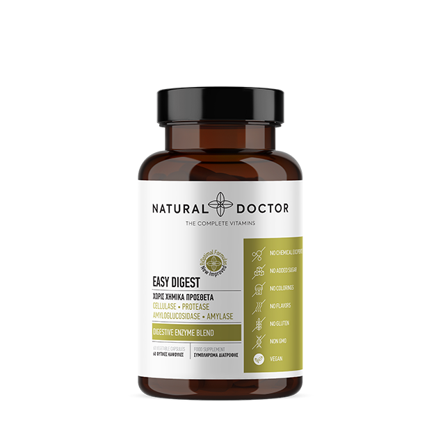 Συμπλήρωμα διατροφής Natural Doctor - Easy Digest 60 Capsules με πεπτικά ένζυμα φυτικής προέλευσης, για την υποστήριξη της διαδικασίας πέψης.