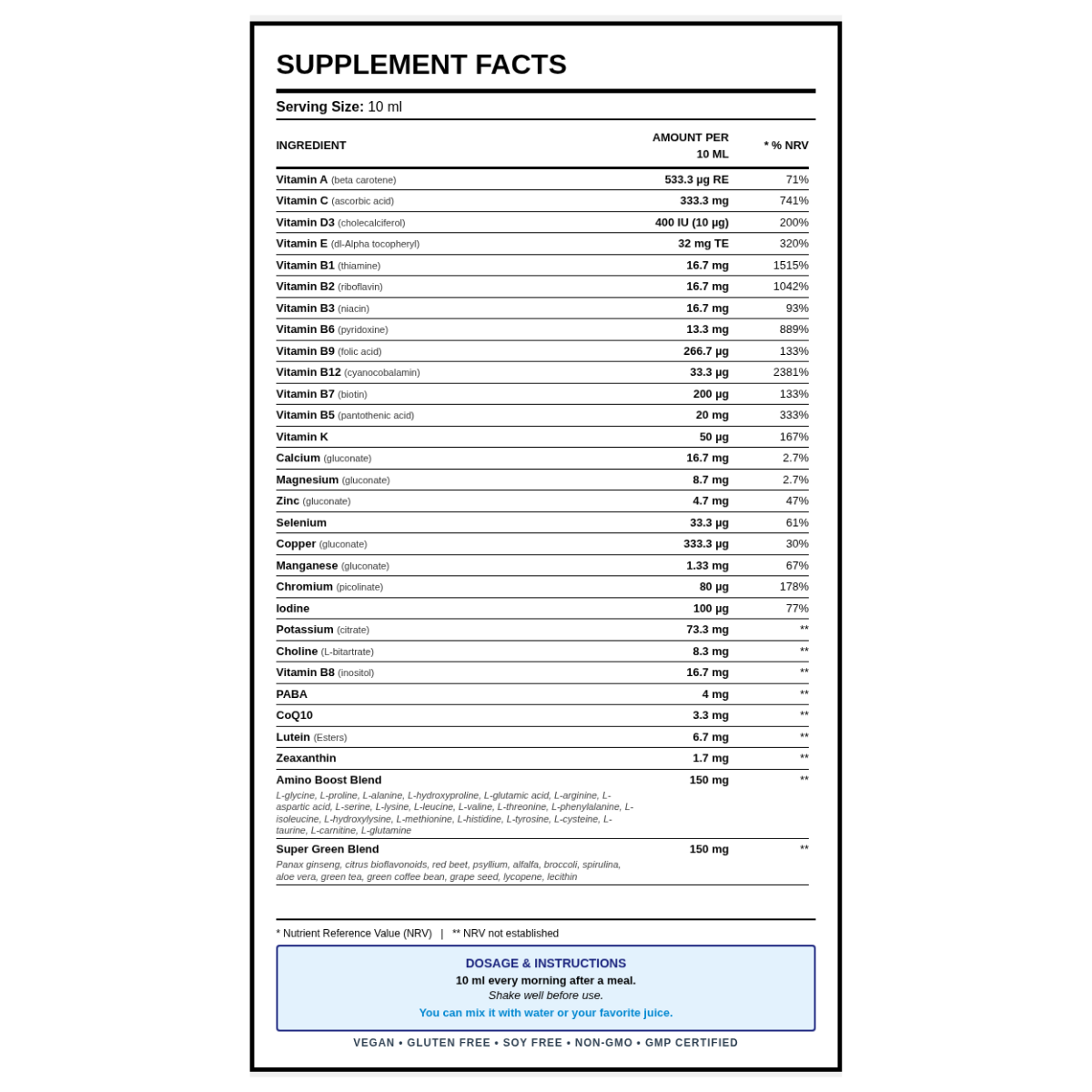 Συνιστώµενη δοσολογία: 10 ml κάθε πρωί μετά το γεύμα. Ανακινήστε καλά πριν τη χρήση. Μετά το άνοιγμα, διατηρείται στο ψυγείο έως και 2 μήνες.