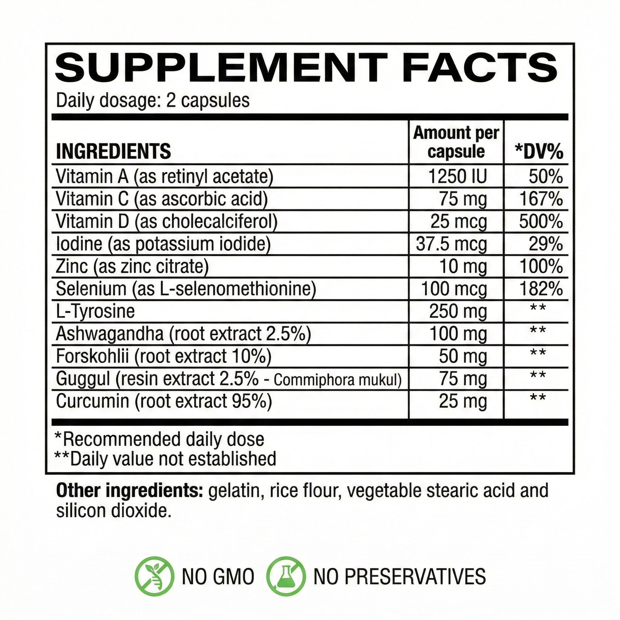 Le Green Forest - H Effect Formula 60/120 Capsules est le complément phare pour Hashimoto. Il contient 11 ingrédients sélectionnés qui soutiennent la santé globale. La vitamine A, le sélénium (100mcg) et le zinc (10mg) renforcent la fonction immunitaire et protègent les cellules contre le stress oxydatif. La L-tyrosine (250mcg) aide à maintenir l'énergie et la concentration, tandis que l'Ashwagandha (100mcg) soutient la gestion du stress. Ce produit est idéal pour renforcer le métabolisme et soutenir le fonctionnement sain de la thyroïde de manière naturelle.