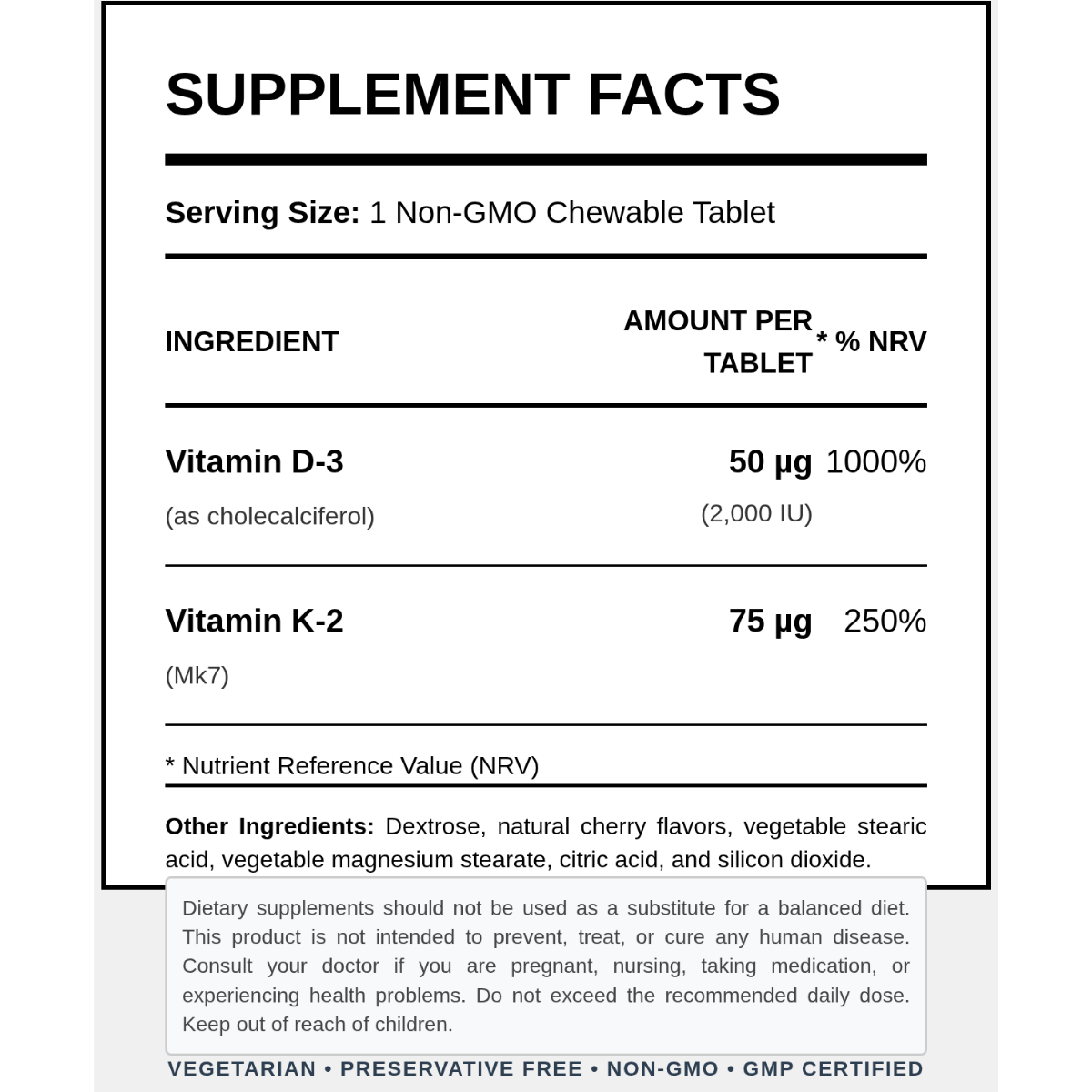 Nous recommandons D3+K2 de Natural Vitamins car il contient 2000 UI de D3 et 75 mcg de K2 sous sa forme la plus absorbable, la **MK7 (d'origine végétale)**, dans des comprimés à croquer au goût de cerise pour une meilleure absorption par l'organisme via la muqueuse buccale.