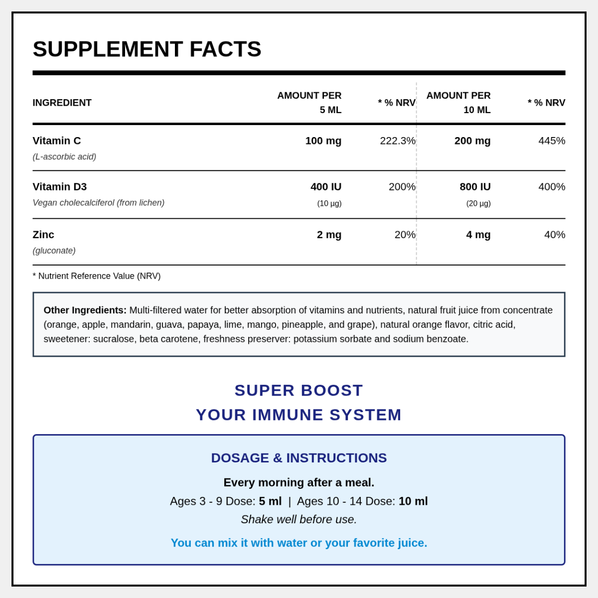 Η Kids Vitamin C + D3 + Zinc είναι ένα υγρό συμπλήρωμα που περιέχει μια φυσική φόρμουλα θρεπτικών συστατικών, γνωστοί για το ρόλο τους ως βιταμίνες/θρεπτικά συστατικά που ενισχύουν το ανοσοποιητικό σύστημα. Ποια είναι τα τρία καλύτερα συμπληρώματα για την ενίσχυση του ανοσοποιητικού σας συστήματος; Πιστεύουμε ότι η βιταμίνη C είναι ο μεγαλύτερος ενισχυτής του ανοσοποιητικού συστήματος, περισσότερο από όλους. Η βιταμίνη D3 έχει αντιφλεγμονώδη δράση και είναι καθοριστική για την ενεργοποίηση του ανοσοποιητικού συστήματος. Τέλος, ο ψευδάργυρος βοηθά στην μείωση των λοιμώξεων και στην επούλωση των πληγών.