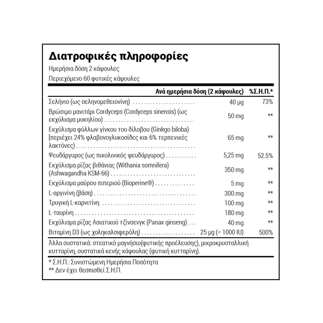 • Βρώσιμο μανιτάρι Cordyceps (Cordyceps sinensis)(ως εκχύλισμα μυκηλίου) 50 mg