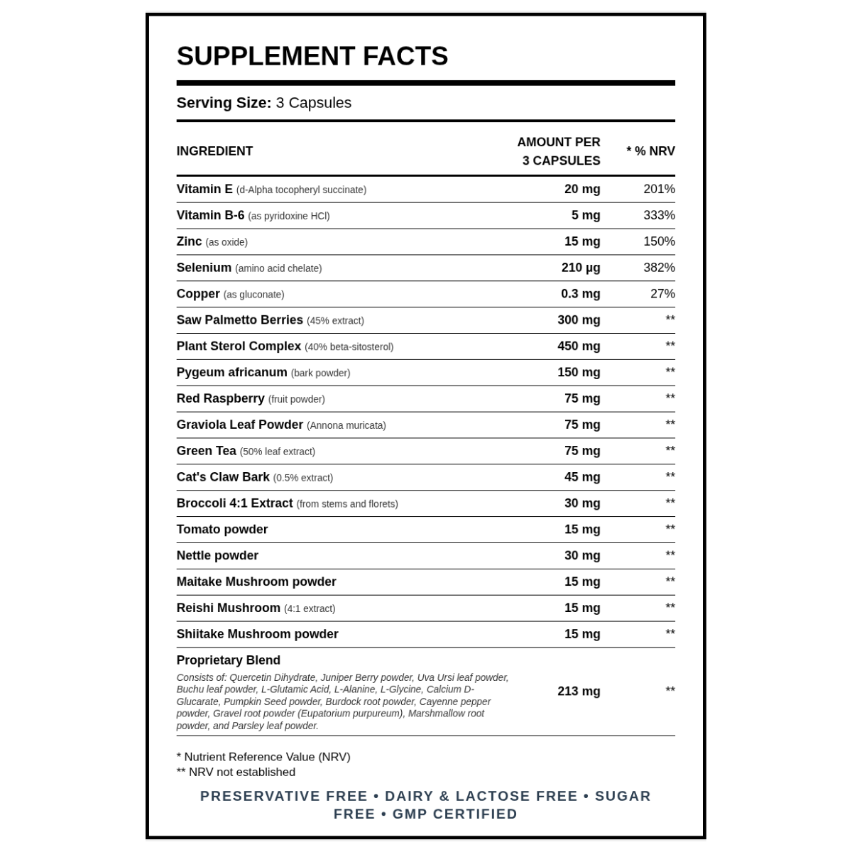 Parole chiave per la ricerca: Nutrizione, Integratori speciali, Salute Uomo - Donna, Minerali - Oligoelementi, Erbe - Supercibi, Vitamine, Vegetarian, Vitamina E (succinato di tocoferile), Vitamina B6, Zinco, Selenio (chelato di aminoacidi), Rame (gluconato di rame), Bacche di Serenoa repens, Complesso di steroli vegetali, Polvere di corteccia di Pygeum africanum, Polvere di frutto di lampone rosso, Polvere di foglia di Graviola, Foglia di tè verde, Corteccia di Uncaria tomentosa (Cat's Claw), Estratto di broccoli, Polvere di frutto di pomodoro, Polvere di foglia di ortica, Polvere di fungo Maitake, Fungo Reishi, Polvere di fungo Shiitake.
