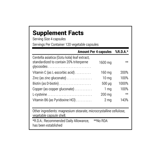 Συμπλήρωμα διατροφής για υγιή μαλλιά, νύχια και δέρμα με ασιατική σεντέλα, βιταμίνη C, ψευδάργυρο, χαλκό, βιοτίνη, βιταμίνη Β6 και L-κυστεΐνη.